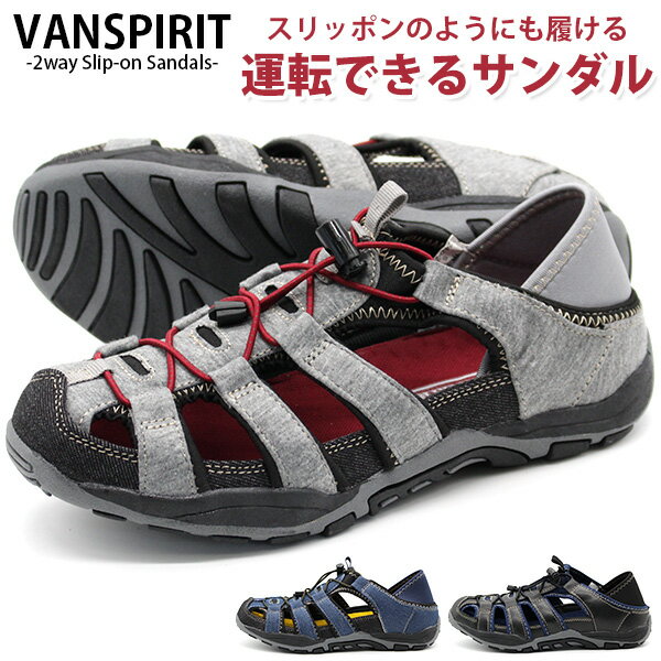 ドライビングシューズ メンズ 靴 黒 ブラック ネイビー グレー デニム ドライビングサンダル スリッポン 軽量 軽い 2way バンスピリット VANSPIRIT VR-73